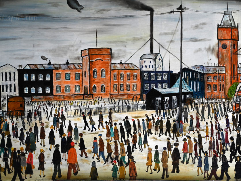 This artwork is a direct copy of L.S. Lowry's iconic industrial scene, "The Factory." It faithfully recreates Lowry's distinctive style, characterised by stylised "matchstick" figures and a somber, industrial cityscape. A large crowd of these figures dominates the foreground, conveying a sense of bustling urban activity. In the background, the familiar Lowry elements are present: factory buildings with prominent chimneys, a tall brick tower, and a general atmosphere of industrial grit. The artist has captured Lowry's characteristic use of a muted colour palette, primarily greys and browns, which contributes to the artwork's sombre tone.